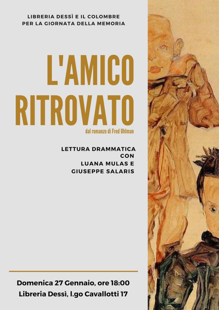 Domenica 27 Gennaio, alle ore 18:00, in occasione della Giornata della Memoria, a Sassari, nello spazio eventi della Libreria Dessì in largo Cavallotti 17, andrà in scena la drammatizzazione di un testo fondamentale della letteratura dedicata alle memorie dell’olocausto, L’amico ritrovato di Fred Uhlman. A dare voce e corpo alle parole dello scrittore l’intensa interpretazione dell’attrice Luana Mulas e dell’attore Giuseppe Salaris.