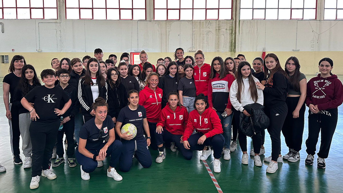 Sassari. Nella mattinata di oggi, 26 aprile, una delegazione di giocatrici rossoblù della Torres, insieme al presidente Andrea Budroni, hanno incontrato i ragazzi e le ragazze della Scuola Media numero 10 a Latte Dolce.