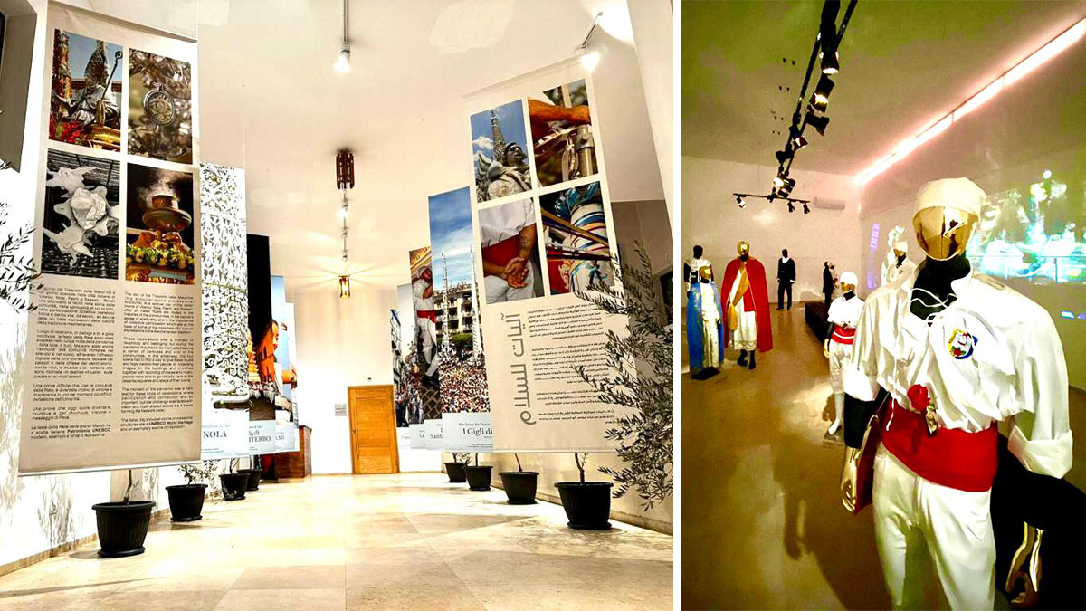L'installazione di arte visiva contemporanea al Bethlehem Peace Center promuove la cultura della tradizione mediterranea e mette in dialogo le feste religiose italiane con quelle locali, sottolineando il valore del patrimonio culturale come strumento di dialogo e convivenza pacifica tra i popoli