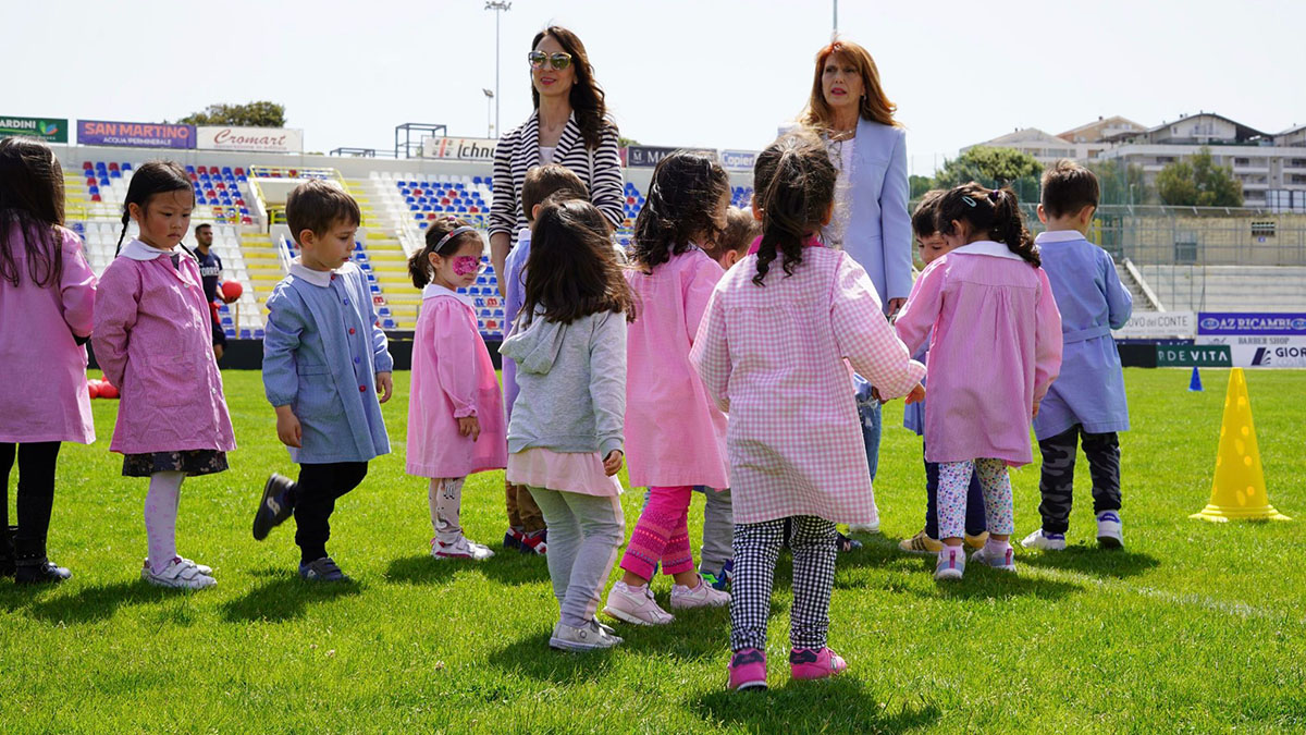 Grembiulini azzurri e rosa, felpe e magliette colorate, una curiosità che supera l’immaginazione e l’entusiasmo della prima volta sull’erba di un grande stadio. In fila per due, qualcuno braccia dietro la schiena salgono la gradinata che porta al campo e poi toccano con mani e piedi il fascino dell’erba dello stadio; trovano ad accoglierli il presidente Stefano Udassi lo staff comunicazione e lo staff tecnico.