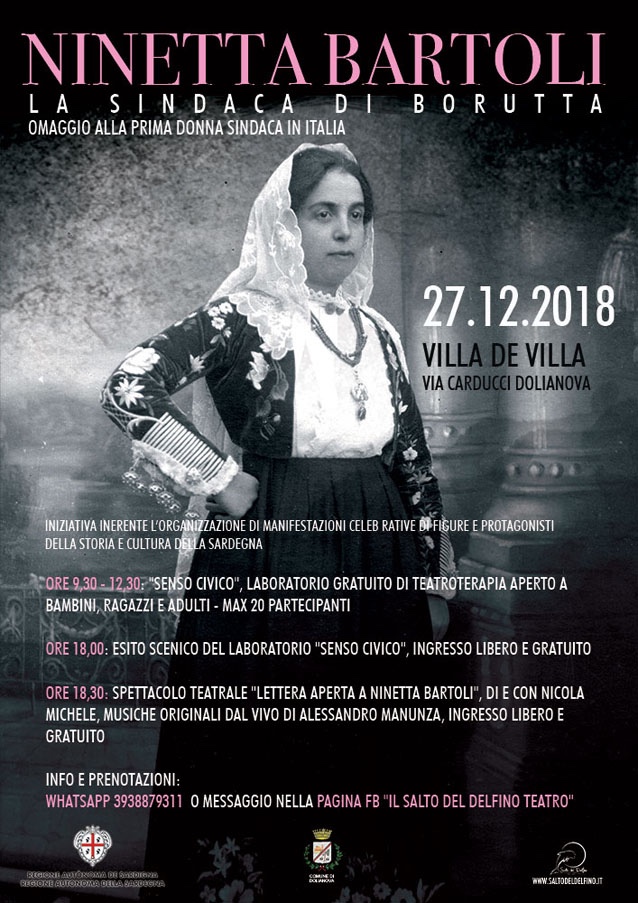 Saranno gli spazi di Villa de Villa ad ospitare lo spettacolo “Lettera aperta a Ninetta Bartoli”, il nuovo monologo messo in scena dalla Compagnia Salto del Delfino, in scena oggi, giovedì 27 dicembre, alle 18.30 (ingresso libero) a Dolianova. Il lavoro è dedicato a Ninetta Baroli, la prima donna italiana ad aver rivestito (per ben dodici anni) la carica di sindaco nel piccolo paese di Borutta (a trenta chilometri da Sassari) a partire dal 1946, ed è ideato e messo in scena da Nicola Michele, con le musiche di Alessandro Manunza.