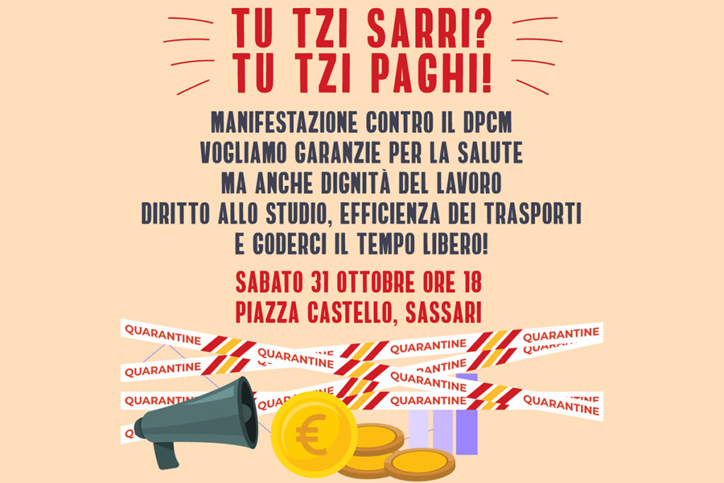 | Riportiamo di seguito il manifesto del neonato comitato “Tu tzi serri? Tu tzi paghi!”, che ha indetto una manifestazione per protestare contro lo Stato Centrale e la Regione in merito alla gestione dell’emergenza Coronavirus e presentare le sue proposte in campo economico, sanitario e sociale. L’appuntamento è per sabato 31 ottobre alle ore 18:00 in Piazza Castello a Sassari. |