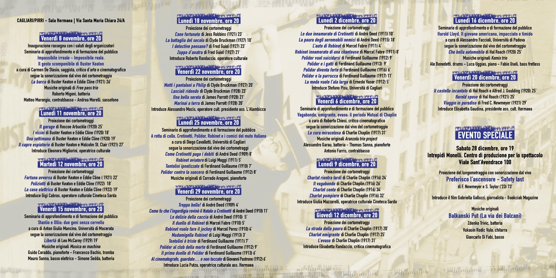 Lunedì 25 novembre 20 Diego Cavallotti dell’università di Cagliari introdurrà “A rotta di collo. Cretinetti, Polidor, Robinet e i comici del muto italiano” e il pianista Corrado Aragoni avrà il compito di sonorizzare i cortometraggi Come Cretinetti paga i debiti (1909), Robinet aviatore (1911), Tontolini ipnotizzato (1910), Polidor contro la suocera (1912).