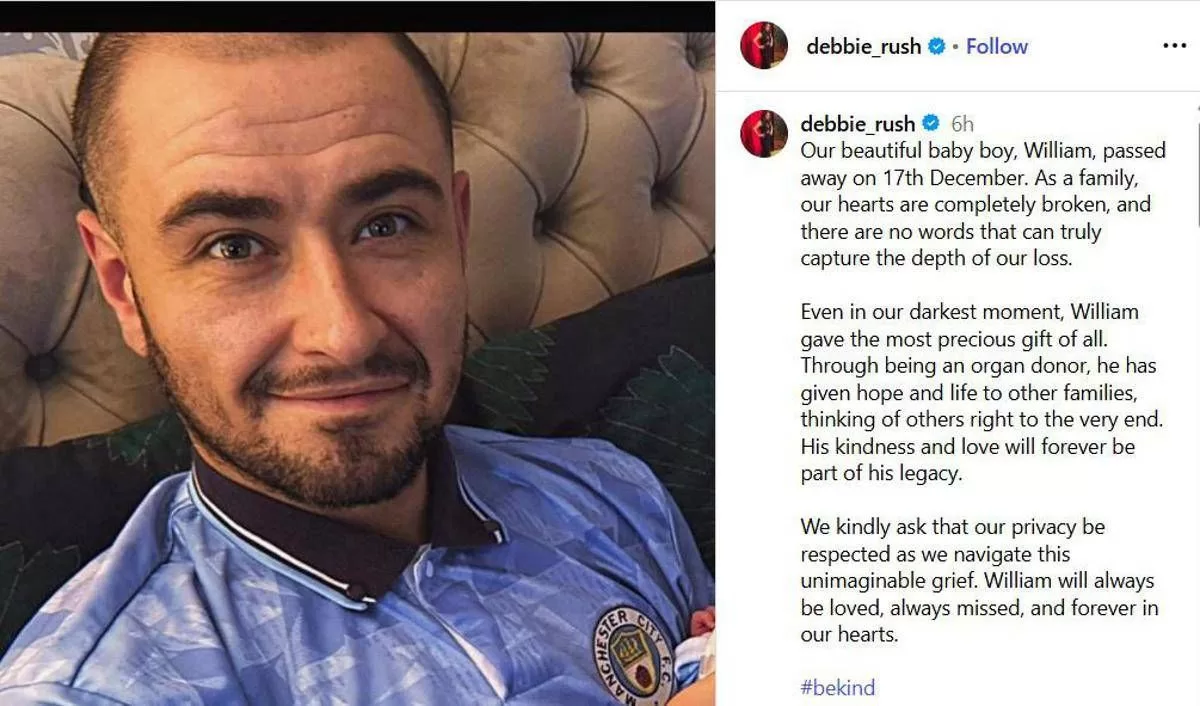 Su Instagram, Debbie Rush ha scritto: “Come famiglia, i nostri cuori sono completamente spezzati”. L’attrice ha descritto William come “il nostro bellissimo bambin” e ha sottolineato la decisione del figlio di diventare donatore di organi: “Anche nel nostro momento più buio, William ha fatto il dono più prezioso di tutti. Essendo donatore, ha dato speranza e vita ad altre famiglie, pensando agli altri fino alla fine. La sua gentilezza e il suo amore faranno sempre parte del suo lascito”.