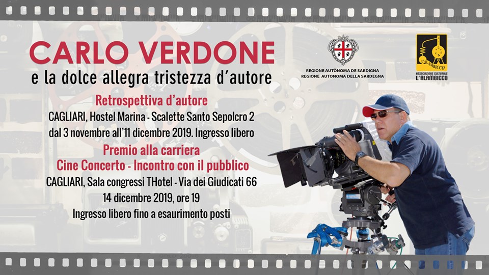 Dal 3 novembre all’11 dicembre l’associazione culturale L’Alambicco, con il sostegno della Regione Sardegna organizza a Cagliari la retrospettiva cinematografica “Carlo Verdone e la dolce allegra tristezza d’autore”, dedicata a un personaggio amatissimo che ha segnato la storia del cinema italiano degli ultimi decenni. Un attore inimitabile, regista, sceneggiatore e comico al quale, il 14 dicembre, nella Sala conferenze del THotel, l’associazione culturale con sede a Elmas conferirà con orgoglio il prestigioso Premio alla Carriera.
