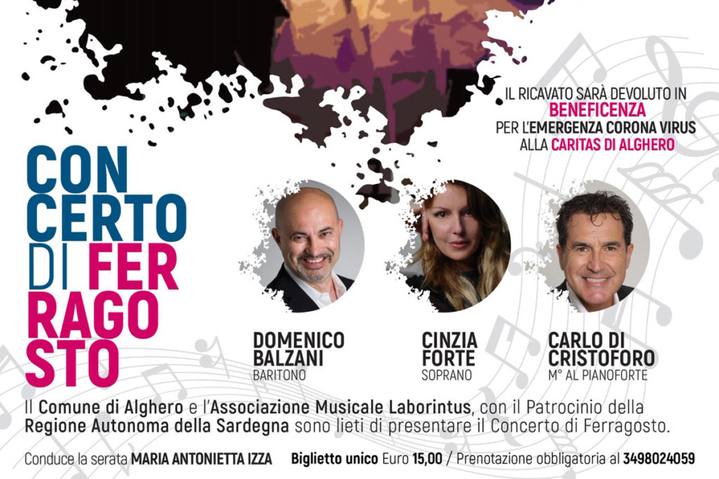Un grande evento di musica e solidarietà nel cuore del centro storico di Alghero. È quello organizzato dall’Associazione Musicale Laborintus per il Ferragosto algherese. Ad esibirsi sabato 15 agosto alle 21 nella corte esterna de Lo Quarter saranno il baritono algherese Domenico Balzani e la soprano Cinzia Forte, accompagnati da Carlo di Cristoforo al pianoforte. La serata, patrocinata dall’Assessorato al Turismo e alla Cultura del Comune di Alghero e dalla Fondazione Alghero, si aprirà con l’esecuzione di celebri arie d’opera, tratte dai “Pagliacci” di Leoncavallo, dal “Barbiere di Siviglia” di Rossini, dalla “Traviata” e dai “Vespri Siciliani” di Verdi, solo per citarne alcune, e da due operette di Franz Lehar, “La vedova Allegra” e “Il Paese del Sorriso”. Tra i brani scelti anche “Summertime”, composta da George Gershwin nel 1935 per l’opera “Porgy and Bess”, “El dia que me quieras” di Carlos Gardel, eseguito per la prima volta dal cantante franco-argentino nell’omonimo film diretto da John Reinhardt. E ancora “O sole mio”, scritta da Giovanni Capurro e composta da Edoardo Di Capua nel 1898. Un programma musicale vario, tra lirica, jazz e tango, per una serata di forte impegno sociale. Il ricavato del concerto sarà, infatti, devoluto in beneficenza alla Caritas di Alghero, come contributo alle attività di sostegno messe in atto durante l’emergenza Coronavirus.