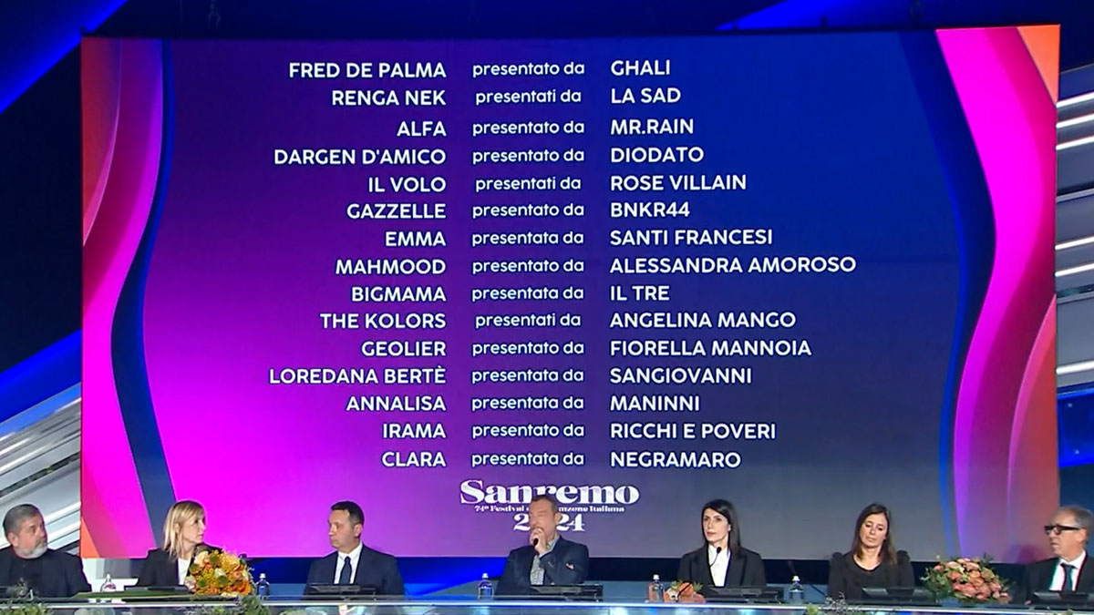 Sul palco questa sera anche Leo Gassmann, l’anno scorso a Sanremo con “Terzo cuore”, che presenterà il film tv “Califano”. A Sanremo sbarca anche il cast di “Mare fuori 4” per lanciare i nuovi episodi della seguitissima serie tv. Ancora, la Nuova Orchestra Santa Balera, che celebrerà i 40 anni del brano “Romagna mia”.