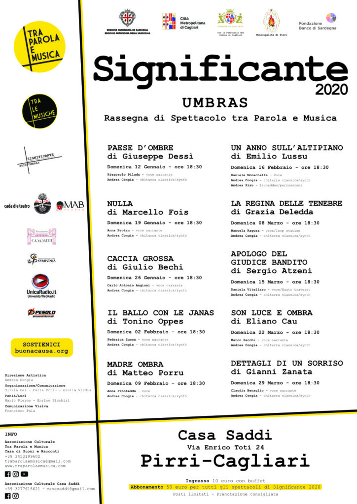 “Significante”. Giunta alla sua tredicesima edizione, la Rassegna di Spettacolo tra Parola e Musica, sarà dedicata anche quest’anno a una selezione di opere che, a vario titolo, rappresentano l’universo letterario della Sardegna. Dieci i titoli in scena di alcuni degli autori più rappresentativi del panorama letterario sardo: Giuseppe Dessì, Giulio Bechi, Emilio Lussu, Grazia Deledda, Sergio Atzeni, Marcello Fois, Tonino Oppes, Matteo Porru, Eliano Cau e Gianni Zanata. “Umbras” (titolo di questa edizione 2020) si svolgerà dal mese di gennaio al mese di marzo 2020, debuttando ad Arbus e proseguendo il suo corso principalmente a Cagliari e, nei mesi successivi, in diverse location in Sardegna e nel territorio extra-isolano. Sul palco diversi interpreti: Pierpaolo Piludu, Anna Brotzu, Carlo Antonio Angioni, Federica Zucca, Anna Fronteddu, Daniele Monachella, Andrea Pisu, Manuela Ragusa, Daniela Vitellaro, Marco Secchi e Claudia Benaglio, insieme al chitarrista e compositore Andrea Congia.