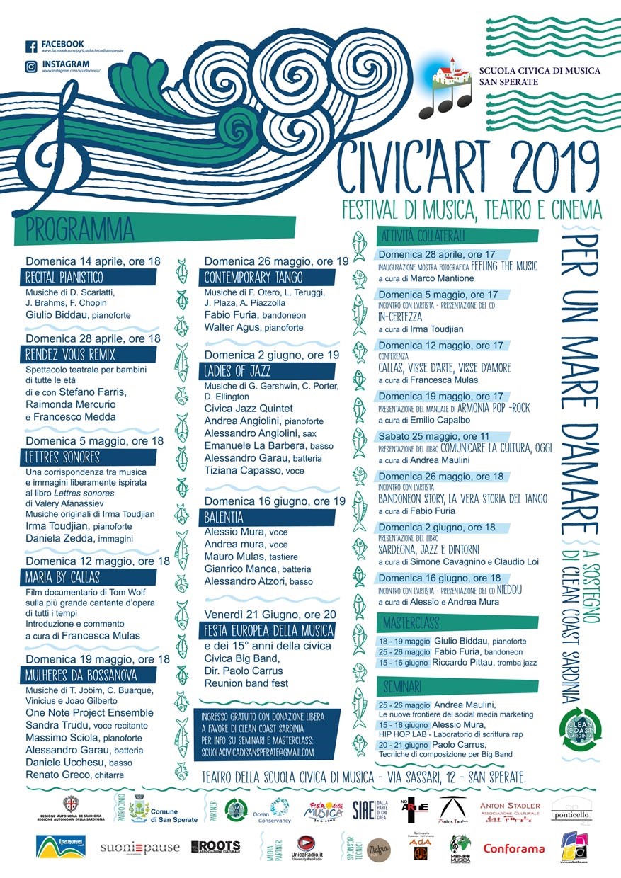 Al via domenica 14 aprile a San Sperate la seconda edizione della rassegna Civic’Art, manifestazione organizzata e promossa dalla Scuola Civica di San Sperate, che per due mesi ospiterà nel Paese Museo numerosi eventi musicali e attività collaterali per sostenere la neonata associazione Clean Coast Sardinia, giovane realtà attivamente impegnata in azioni e campagne a tutela dell’ambiente, tra le quali la pulizia delle coste e del mare dall’inquinamento dilagante (tema più che mai vivo e attuale in Sardegna, dopo la recente morte del capodoglio a Cala Romantica a causa dell’ingestione di ben venti chilogrammi di plastica).
