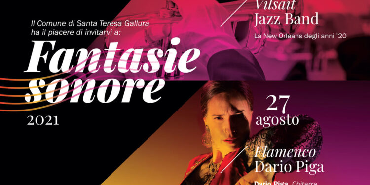 Si alza il sipario sulla VI edizione del Festival “Fantasie Sonore” a Santa Teresa Gallura organizzato dall’Accademia Musicale Bernardo De Muro con la direzione artistica del pianista e direttore d’orchestra Fabrizio Ruggero – con il patrocinio e il sostegno del Comune di Santa Teresa Gallura e della Regione Sardegna: giovedì 26 agosto alle 21:30 nella suggestiva piazzetta Santa Lucia riecheggeranno le note della Vilsait Jazz Band che rievoca le atmosfere de “La New Orleans degli anni ’20” a ritmo di Dixieland mentre venerdì 27 agosto alle 21:30 sarà la volta di un ideale viaggio in Andalusia con il “Flamenco” dell’ensemble che schiera Dario Piga alla chitarra e Mateo Garriga al cajón, con Mónica Clavijo Barroso (voce) e la danzatrice María Keck.