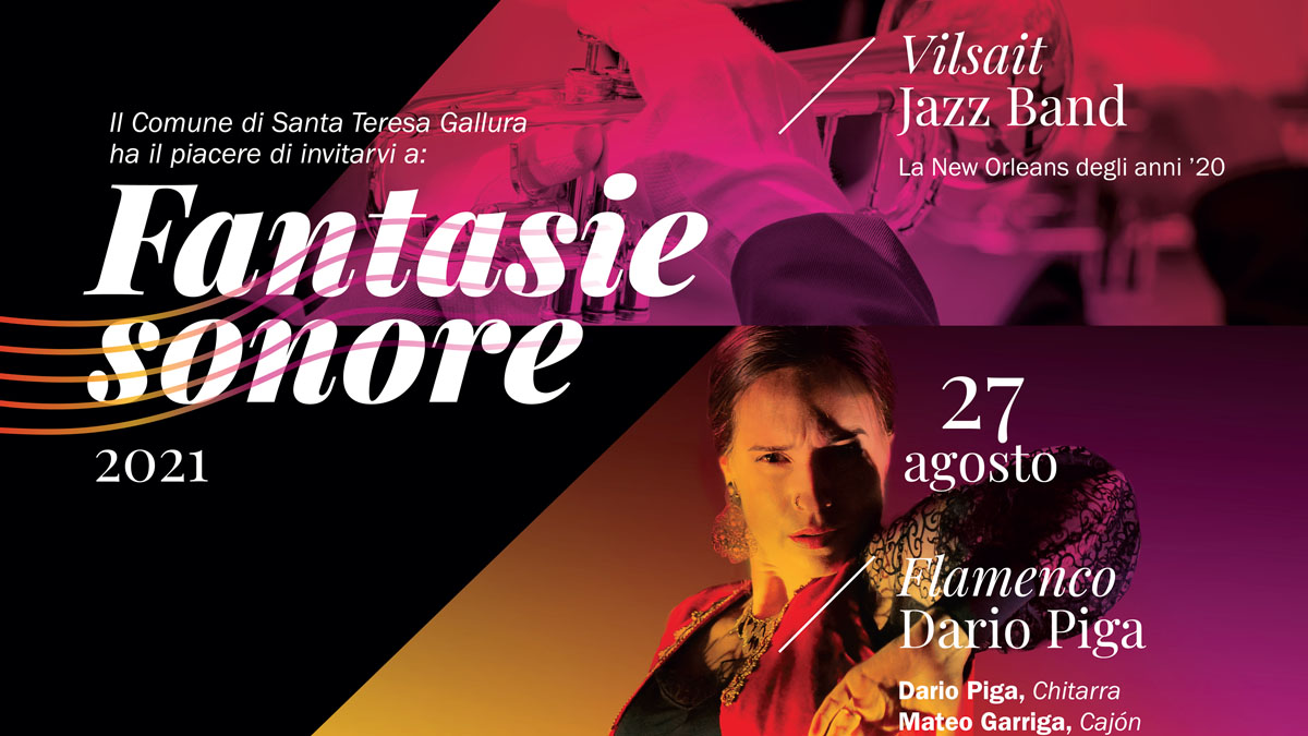 Si alza il sipario sulla VI edizione del Festival “Fantasie Sonore” a Santa Teresa Gallura organizzato dall’Accademia Musicale Bernardo De Muro con la direzione artistica del pianista e direttore d’orchestra Fabrizio Ruggero – con il patrocinio e il sostegno del Comune di Santa Teresa Gallura e della Regione Sardegna: giovedì 26 agosto alle 21:30 nella suggestiva piazzetta Santa Lucia riecheggeranno le note della Vilsait Jazz Band che rievoca le atmosfere de “La New Orleans degli anni ’20” a ritmo di Dixieland mentre venerdì 27 agosto alle 21:30 sarà la volta di un ideale viaggio in Andalusia con il “Flamenco” dell’ensemble che schiera Dario Piga alla chitarra e Mateo Garriga al cajón, con Mónica Clavijo Barroso (voce) e la danzatrice María Keck.