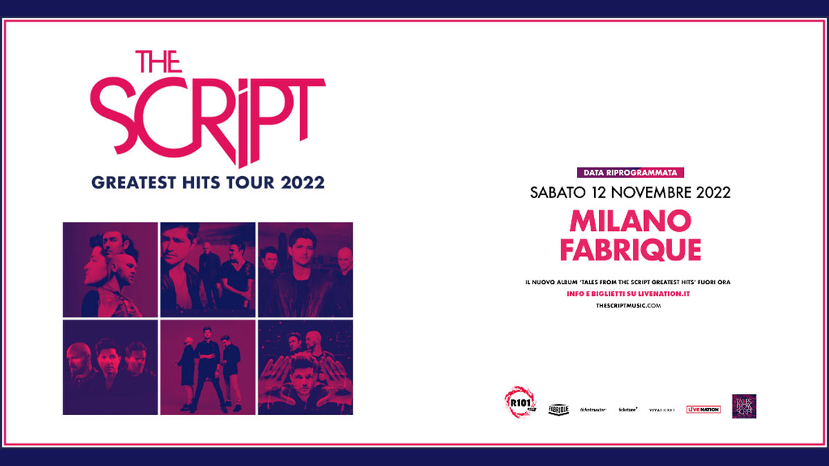 L’appuntamento del Greatest Hits Tour 2022 dei The Script, previsto originariamente al Fabrique di Milano il 12 marzo 2022, è stato riprogrammato al 12 novembre 2022. Calum Scott non sarà presente come opening act dello show.