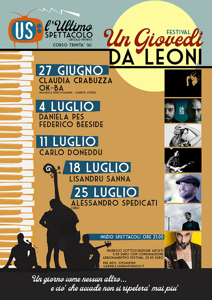 Dal 27 giugno al 25 luglio, presso “l’Ultimo Spettacolo” in Corso Trinità 161 a Sassari, prenderà vita il Festival “Un Giovedì da Leoni”, che vedrà la partecipazione di Artisti che in questi anni hanno dato lustro alla musica in Sardegna.
