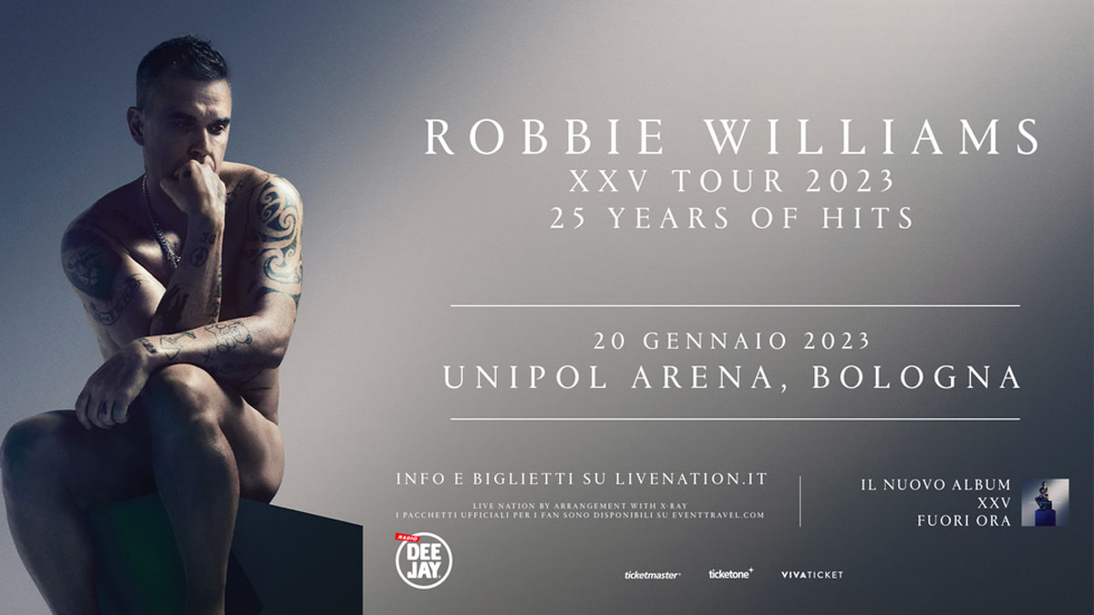 Arriva finalmente anche in Europa il “XXV Tour”, il tour di Robbie Williams che celebra i suoi incredibili 25 anni carriera solista. Robbie sarà in Italia per un unico e imperdibile appuntamento venerdì 20 gennaio alla Unipol Arena di Bologna.