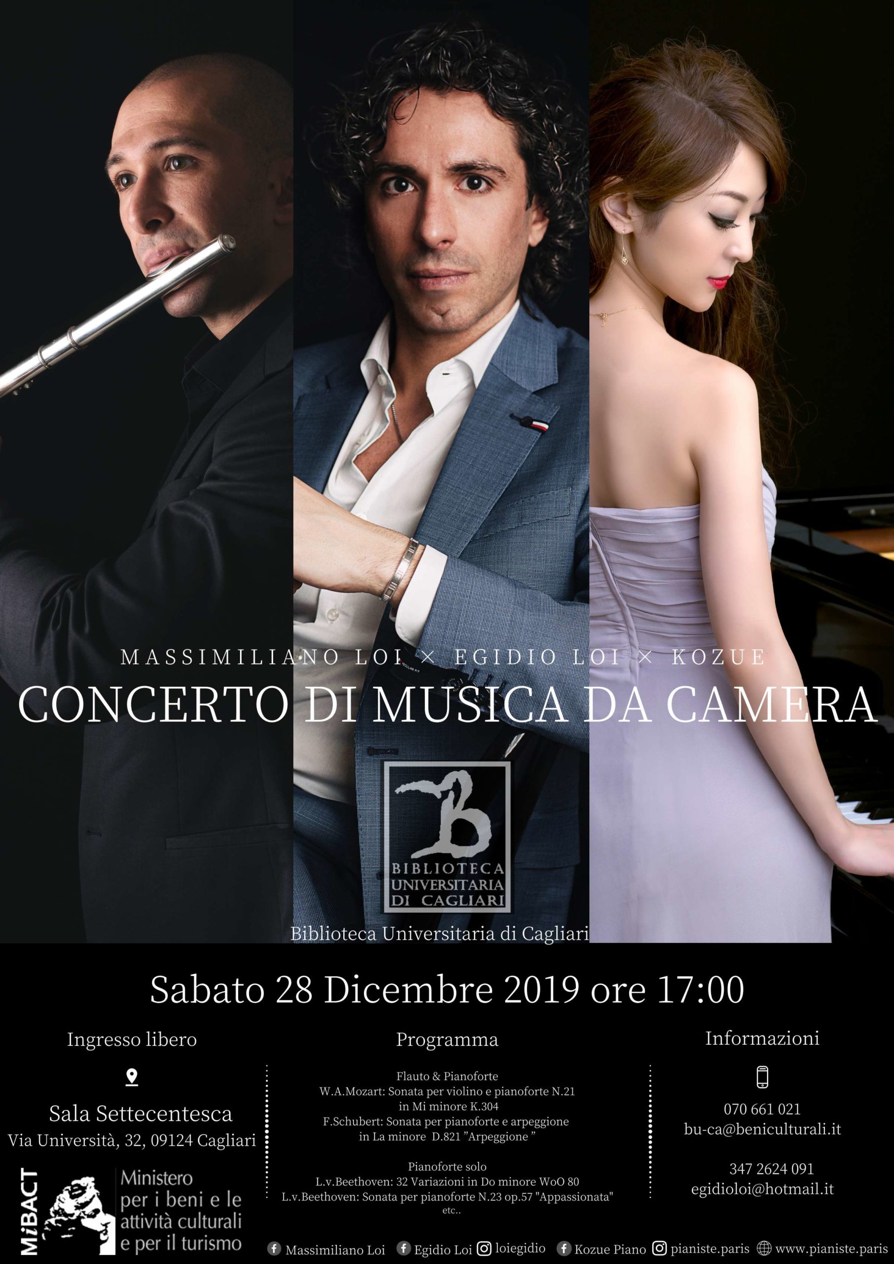 Sabato 28 dicembre alle ore 17:00, nella splendida cornice della Sala Settecentesca della Biblioteca Universitaria di Cagliari, andrà in scena il concerto di Musica da Camera del pianista cagliaritano Egidio Loi, il flautista Massimiliano Loi e la pianista giapponese Kozue.