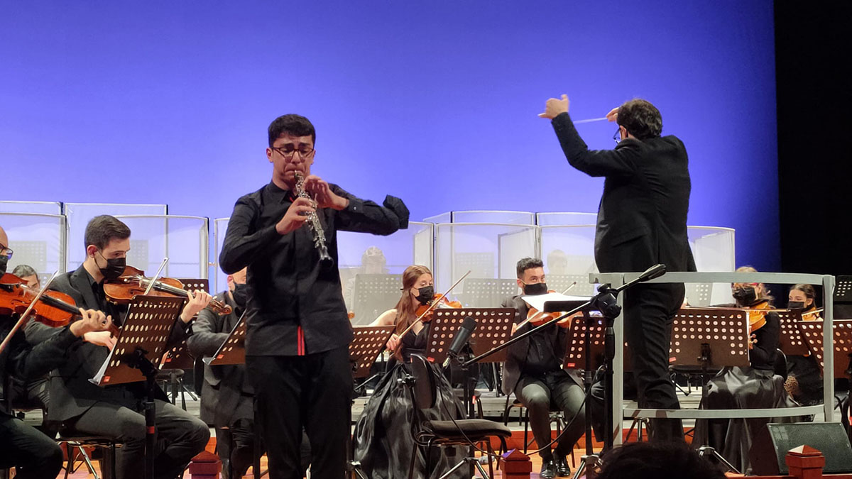 Ad aprire la serata è stato il talentuoso quindicenne Carlo Cesaraccio impegnato nel concerto per oboe e orchestra “KV 314” in do maggiore di Mozart. In questa celebre composizione scritta nel 1777 lo strumento solista primeggia nelle piacevolissime ed eleganti linee melodiche tipicamente mozartiane e nelle brillanti cadenze. Carlo Cesaraccio ha dato prova nell’esecuzione di grande padronanza tecnica e notevole sensibilità.