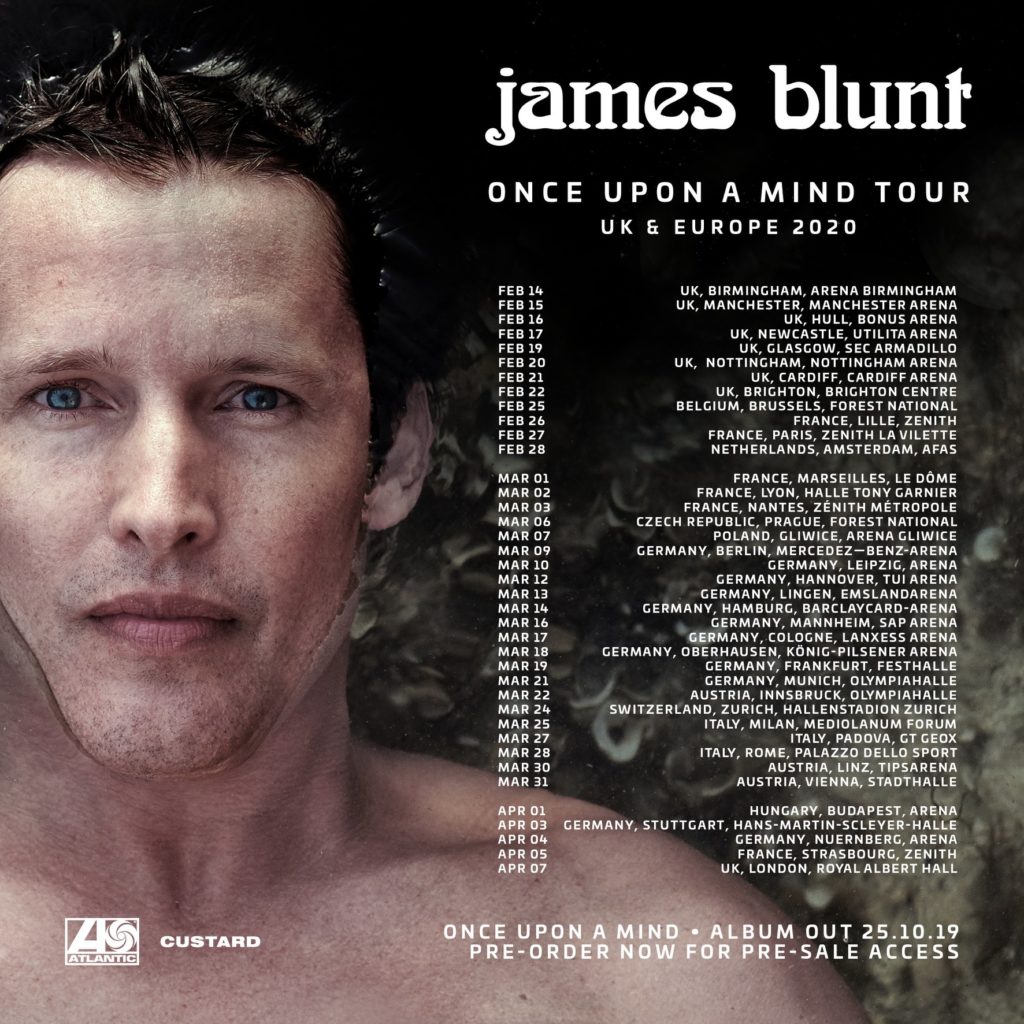 Poco dopo la notizia dell’uscita del suo sesto album in studio “Once Upon a Mind” il 25 ottobre su etichetta Atlantic Recods, James Blunt annuncia oggi il suo nuovo tour in Europa. Tre le date italiane previste per il 2020: il 25 marzo al Mediolanum Forum di Milano, il 27 alla Kioene Arena di Padova e il 28 al Palazzo dello Sport a Roma.