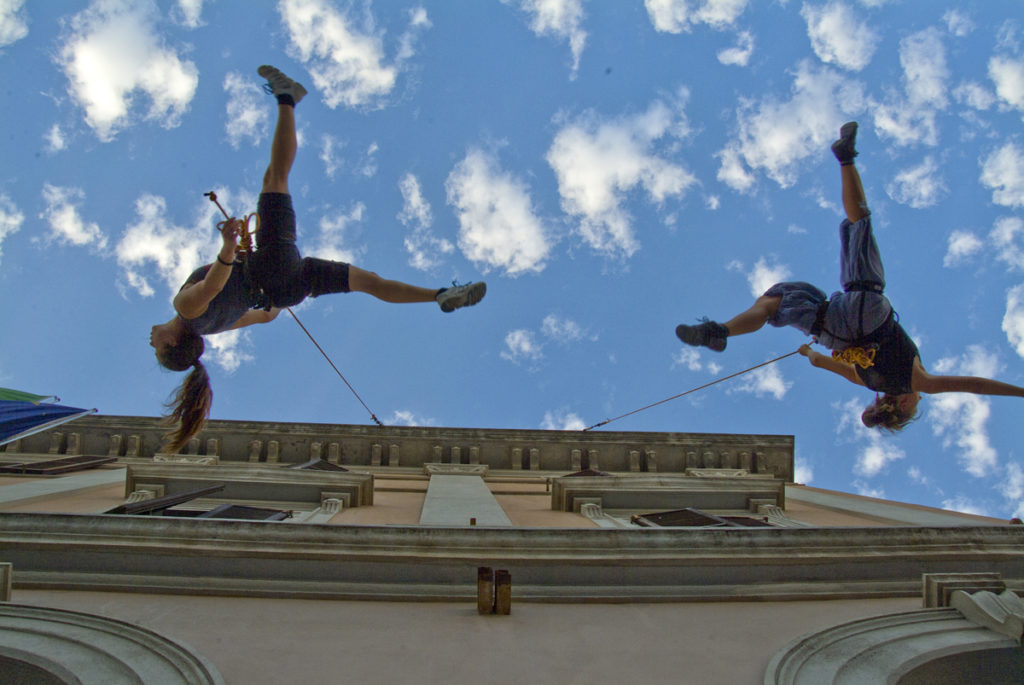 Si intitola Lassù le ali non hanno ruggine. Il suo tema principale è il volo, come metafora della libertà. Ci siamo ispirati molto alle invenzioni di Leonardo Da Vinci, perché lo spettacolo mette in scena un museo ambulante di macchine volanti. All’interno di questo museo, attraverso l’azione scenica, viene proposta una riflessione su cosa significa libertà nel mondo di oggi, e se tutti noi siamo disposti ad accettare certi sviluppi aberranti derivanti dal progresso, che limitano la libertà dell’uomo. In questo spettacolo compaiono le nostre macchine sceniche, e viene fuori anche il loro aspetto estetico grottesco e surreale.