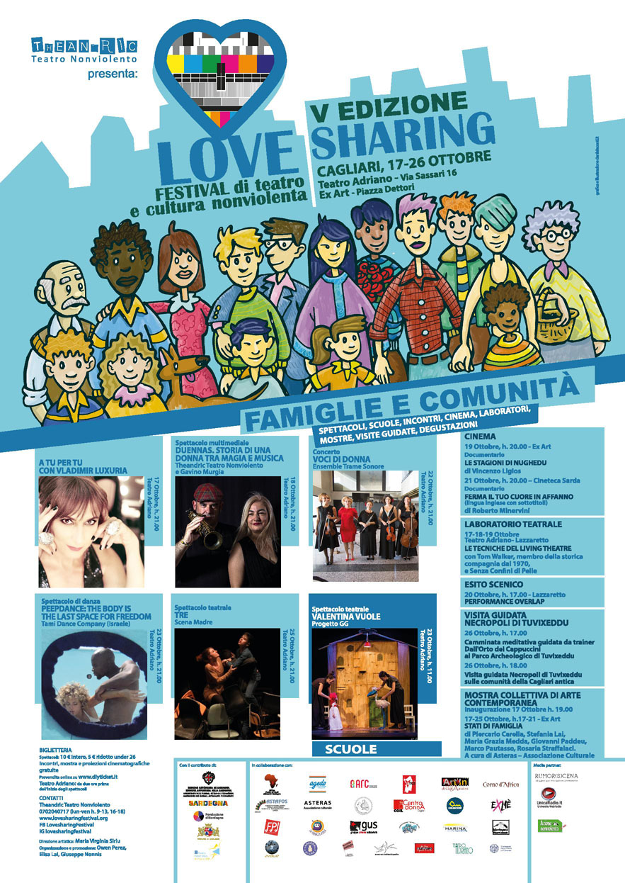“Cosa spinge gli individui a creare legami duraturi e vivere insieme, riconoscendosi come un’entità unica, anche se al suo interno composta e variegata? Quali sono le diverse forme sociali che ne derivano? In che modo interagiscono tra loro? E, soprattutto, quali sono quelle che maggiormente riescono a fare dei propri membri delle persone libere, cercando di eradicare la violenza che da sempre affligge le società umane? Come sempre, Love Sharing punta a mostrare la ricchezza insita nella diversità, abbandonando la dittatura del singolare (il mito di una famiglia, una comunità) per la libertà del plurale – afferma la direttrice artistica Maria Virginia Siriu -, porteremo in primo piano le famiglie multiculturali, non presentandole come mostri mitologici, bensì passando direttamente a loro la parola, così come le famiglie arcobaleno (in collaborazione con associazioni attive nel settore); presenteremo forme di associazione straniere, a noi per lo più sconosciute, come i kibbutz israeliani, fino a scoprire le comuni anarchiche del mondo teatrale, come il Living Theatre di Judith Malina e Julian Beck. Famiglie e comunità verranno considerate non solo nella loro varietà osservabile nel mondo contemporaneo, ma anche nel loro cambiamento diacronico: dalla famiglia mononucleare, chiusa e poco solidale con il resto della società, fino alla nascita di forme di mutua assistenza come il co-housing, espressione di una forte esigenza di solidarietà a livello comunitario.