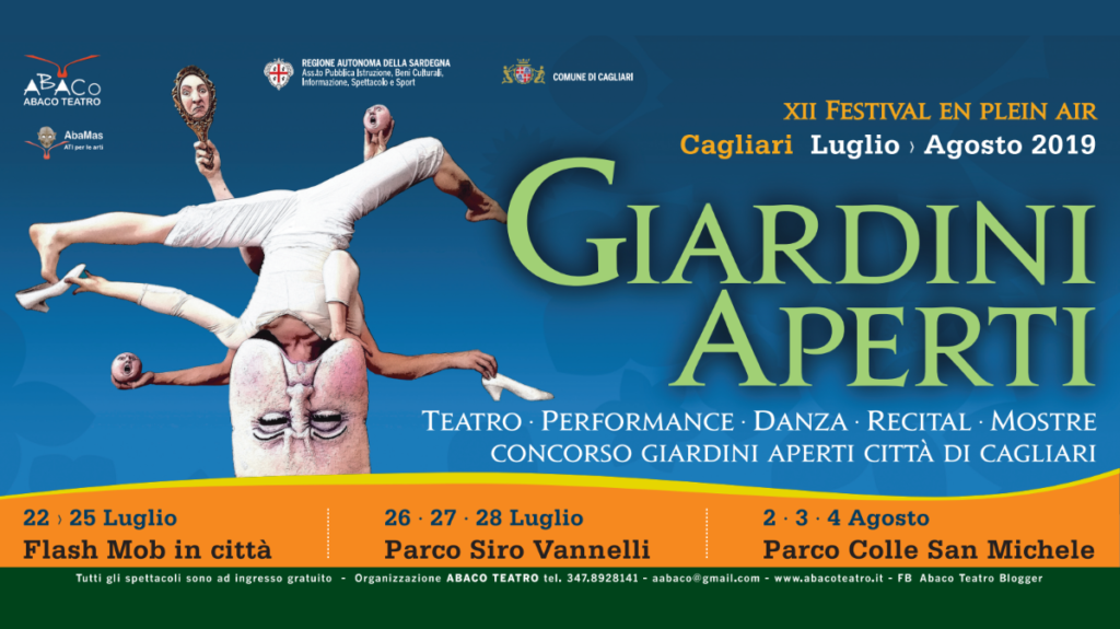 Il XII Festival Giardini Aperti inizierà per le vie di Cagliari – tra lunedì 22 e giovedì 25 luglio la città sarà animata dalle performances degli artisti in forma di Flash Mob – poi la kermesse entrerà nel vivo con tre intense giornate – dal 26 al 28 luglio – al Parco Siro Vannelli nel quartiere Fonsarda: ogni sera un doppio appuntamento con uno spettacolo di teatro ragazzi e una pièce dedicata al pubblico adulto.