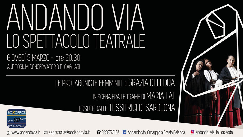 Tradotta in oltre quaranta lingue e conosciuta in tutto il mondo, Grazia Deledda fatica ancora oggi a trovare spazio nei luoghi della cultura italiana, dalle scuole alle università. Lo spettacolo “Andando via. Omaggio a Grazia Deledda” è nato anche con l’intento di far conoscere le sue opere, la forza delle donne di Sardegna da lei narrate e l’autrice stessa attraverso i suoi personaggi femminili, tra i quali troviamo Cosima – interpretata da Rita Atzeri –, alter ego dell’autrice nel romanzo autobiografico omonimo.