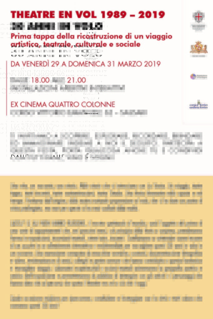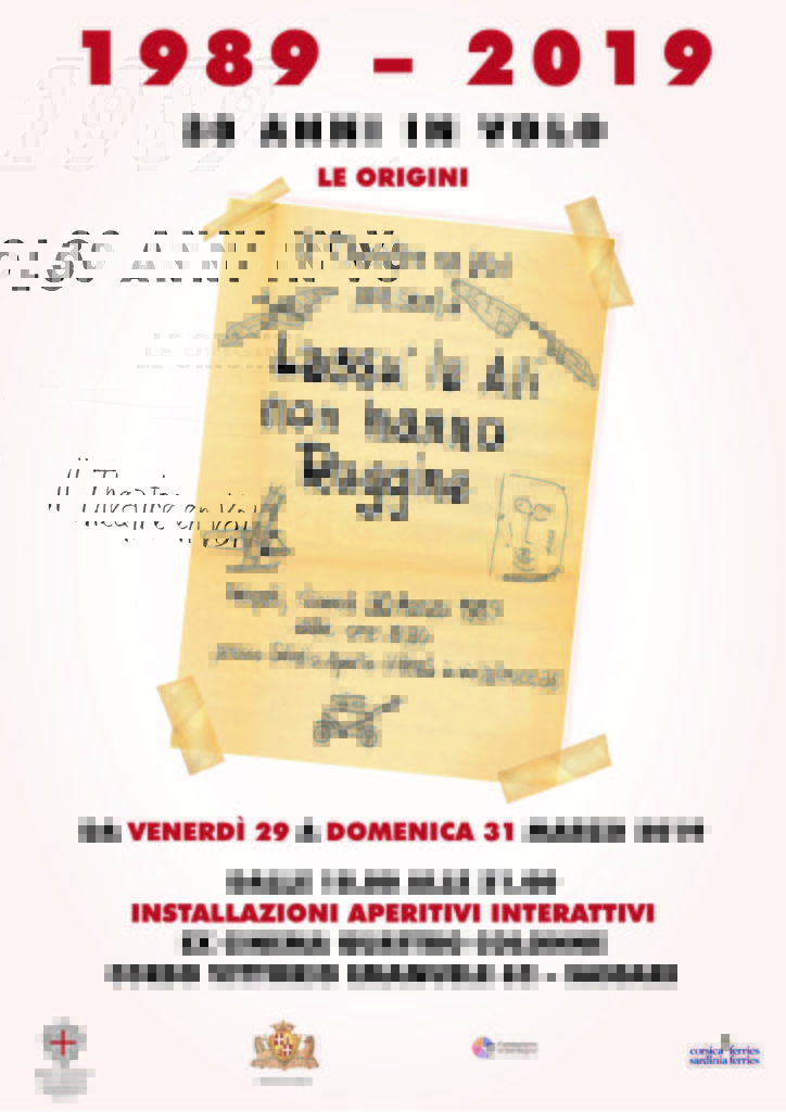 Nel 2019 la compagnia theatre en vol festeggia i suoi 30 anni e invita tutti, grandi e piccoli, sassaresi e non, reali e digitali, provenienti da tutte le parti del mondo a festeggiare e partecipare ad un percorso che parte dalle Installazioni Aperitivi Interattivi con “Lassù le ali non hanno ruggine”, presso l’Ex Cinema Quattro Colonne, emblema di uno spazio nostalgico di tempi passati, ormai crocevia tra la parte alta e quella bassa del Centro Storico di Sassari che verrà restituito alla sua fruizione. Un appuntamento accogliente e familiare che porterà la compagnia in un conviviale incontro allestito con essenziali installazioni e paesaggi sonori. Una festa nello spazio e nel tempo per la condivisione di un percorso artistico, multidisciplinare, interculturale ed interattivo, all’insegna della rigenerazione urbana della città.