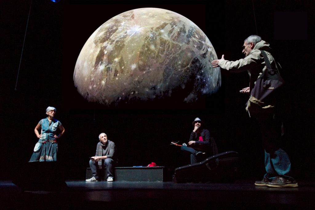 “Io e Ganimede” – con un titolo che rimanda forse al principe troiano divenuto coppiere degli dèi secondo il mito, ma più verosimilmente al maggior satellite di Giove, o magari all’omonimo asteroide – è quindi un sogno da vivere ad occhi aperti, una strana avventura da affrontare in compagnia dei protagonisti, sul filo della suspense e con il piacere della meraviglia. I quattro novelli “pionieri” dello spazio si interrogano sul volto nascosto della realtà, sulle verità oltre la superficie, sugli equilibri tra forze che regolano il mondo – conosciuti dagli scienziati, ma spesso ignorati dal grande pubblico – in un inedito divertissement fra teatro e musica, astrofisica e poesia.