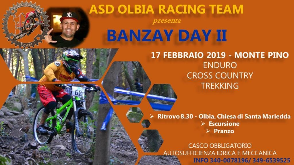 Il Banzay Day, organizzato dall’associazione dilettantistica ADS Olbia Racing Team, fondata da Gabriele Destro e Mirko Cuccu, si articolerà su tre piste: la prima riservata agli enduristi più esperti che potranno raggiungere la vetta e cimentarsi in una staffetta all’ultima pedalata tra spettacolari “single track” e discese ardite. Più adatto agli appassionati degli sport all’aria aperta, abituati alla fatica ma meno sprezzanti del pericolo, è il percorso in puro stile cross country: una pedalata lungo la bretella panoramica di Monte Pino fino al belvedere che offre una spettacolare vista sulla costa. Infine, un percorso di trekking tra la fitta vegetazione del monte alla scoperta dei punti panoramici più suggestivi. Alla guida delle escursioni ci sarà un team di esperti delle discipline sportive e profondi conoscitori dei percorsi. Tra questi anche il quattro volte campione sardo di enduro e attuale detentore del titolo, Gianluca Cara. Con lui anche Gabriele Destro, Gianluca Spano, Damiano Carta, Davide Longu e Francesco di Cesare, ex campioni regionali. La seconda edizione del Banzay Day è dedicata a Mario Gasparoli, alias “Banzay”, presidente onorario della ASD Olbia Racing Team e mentore di tanti giovani bikers: tre volte campione sardo.