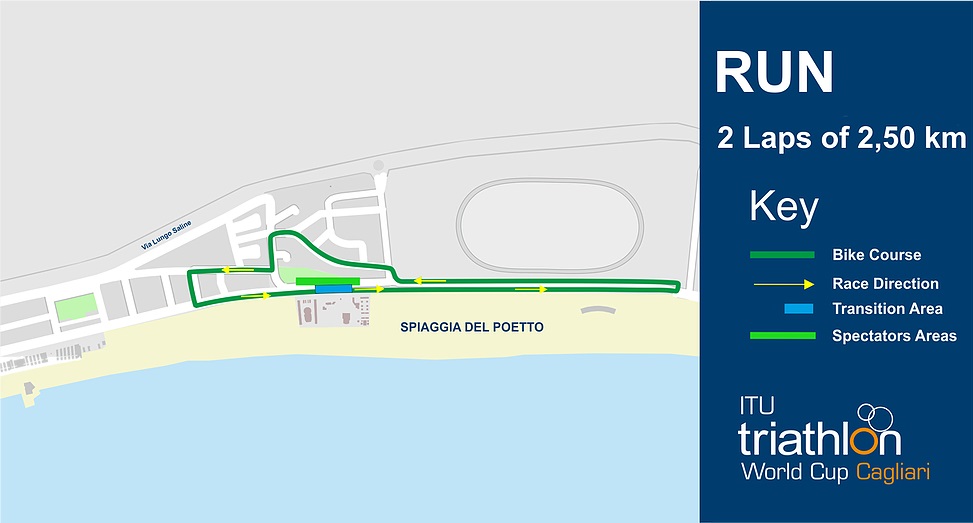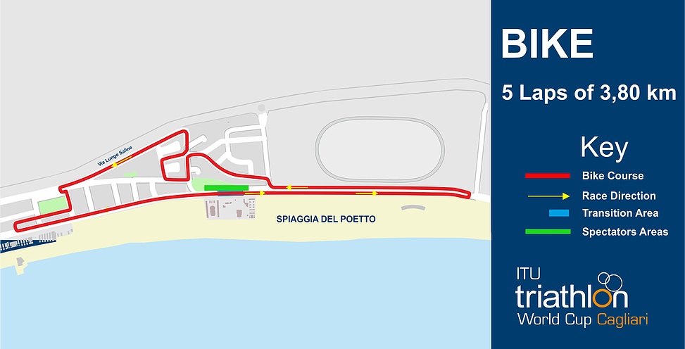 In uno dei luoghi del cuore di Cagliari, il percorso di gara si presenta come un vero circuito, veloce. Prima la frazione di nuoto nelle acque del Poetto, su un singolo giro di 750 metri con partenza dalla spiaggia. Poi bicicletta per 19 chilometri: 5 giri uguali da 3,8 . Infine 5.000 metri di corsa su un anello di 2,5 chilometri, da ripetere 2 volte prevalentemente sul Lungomare.