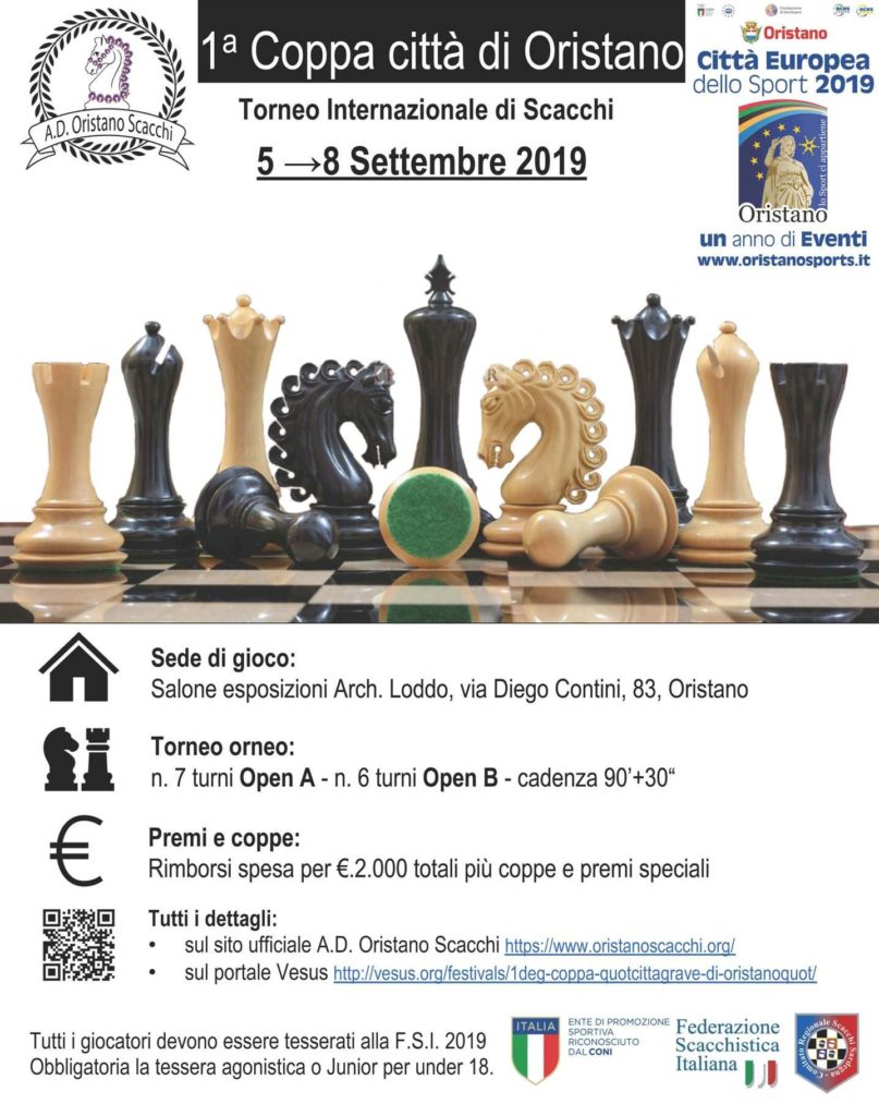 Il torneo internazionale, organizzato dall’Associazione dilettantistica Oristano scacchi con la collaborazione dell’Assessorato allo Sport del Comune di Oristano e il patrocinio della Federazione scacchistica italiana e del CONI, si giocherà in città (nel Salone esposizioni dell’architetto Loddo in via Diego Contini 83) dal 5 all’8 settembre con un montepremi di 2000 euro.