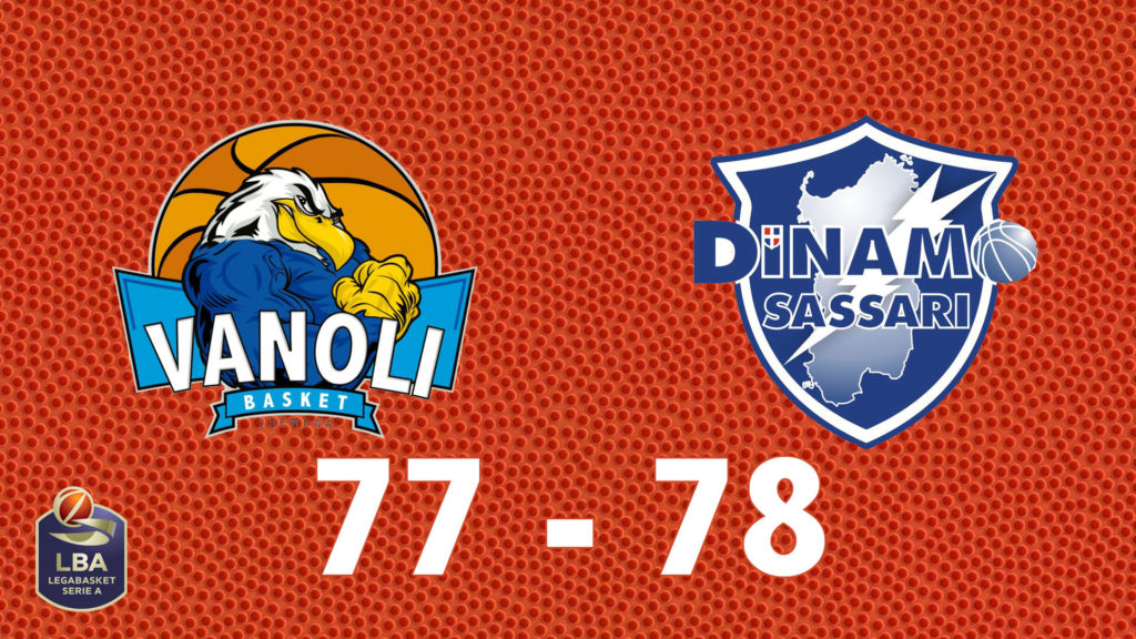 Vittoria al fotofinish per la Dinamo Banco di Sardegna Sassari sul campo della Vanoli Cremona, nella nona giornata di ritorno della Serie A di basket. La squadra allenata da coach Federico Pasquini si è imposta con il punteggio di 78-77, al termine di una gara molto sofferta, riacciuffata per i capelli nell’ultimo minuto.