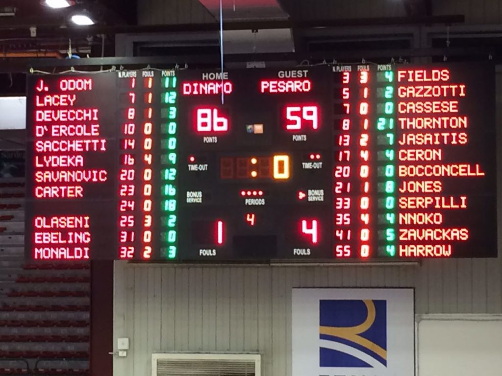 Josh Carter iniziava la partita così come aveva terminato quella di qualche giorno prima in coppa: mano caldissima dall’arco e quattro triple in meno di metà frazione. La Dinamo macinava punti e a 3’10” dalla prima sirena trovava il proprio massimo vantaggio, +12, sul 20-8, con due liberi di Savanovic. Pesaro rimaneva a bocca asciutta per quasi quattro minuti, ma a 2’26” dal termine del quarto si sbloccava ed infilava un parziale di 8-0, trascinata da un Thornton indemoniato, che la riportava completamente in partita (20-16 per il Banco). Ora era la Dinamo a faticare a trovare il canestro e coach Pasquini chiamava time-out per riorganizzare i giochi dei suoi. Al rientro in campo i biancoblù apparivano decisamente più tonici e attenti, recuperavano alcuni palloni e chiudevano il periodo sul 24-18.