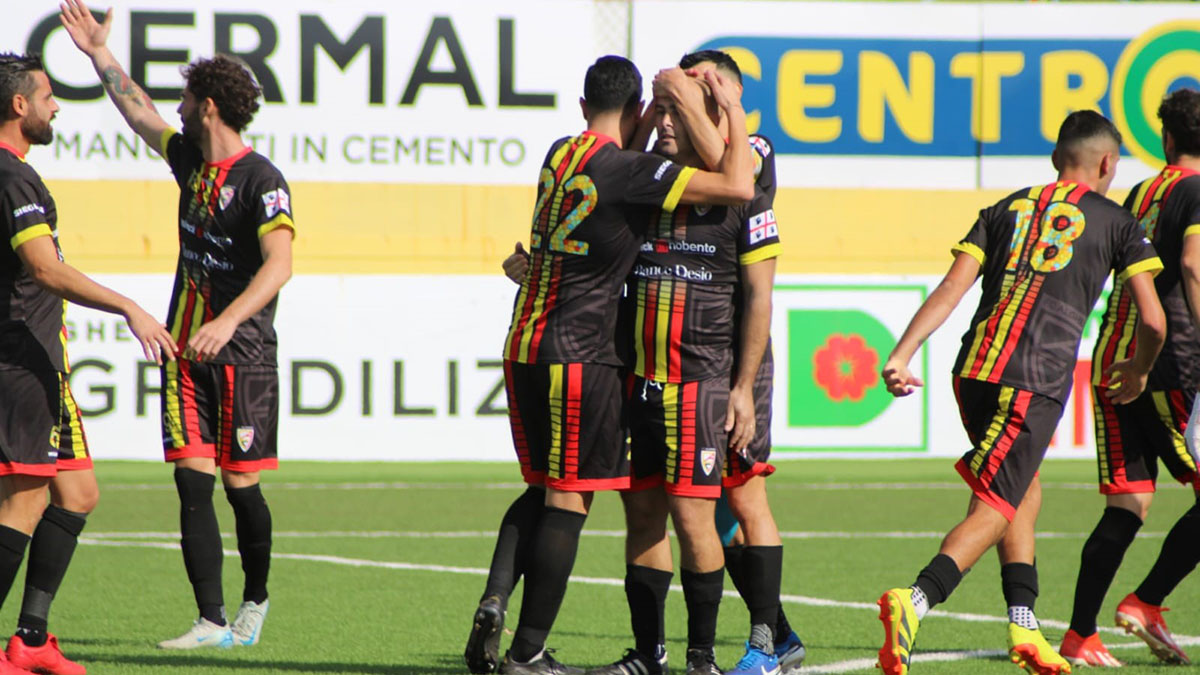Michele Cherchi festeggiato dai compagni dopo il gol