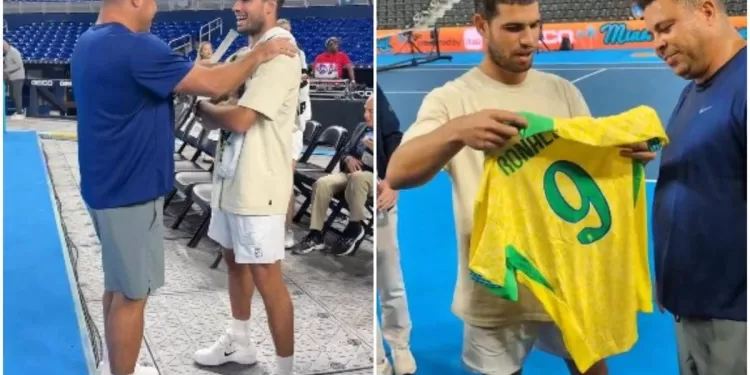 I due hanno scambiato qualche pallina prima di fermarsi per una breve chiacchierata sotto rete, in cui Carlos ha anche dato qualche consiglio mimando il gesto del dritto, colpo su cui, evidentemente, Ronaldo deve ancora migliorare. Ronaldo ha inoltre regalato ad Alcaraz una maglia del Brasile autografata, che ha ringraziato abbracciando l’ex attaccante, tra le altre, di Inter e Milan.
