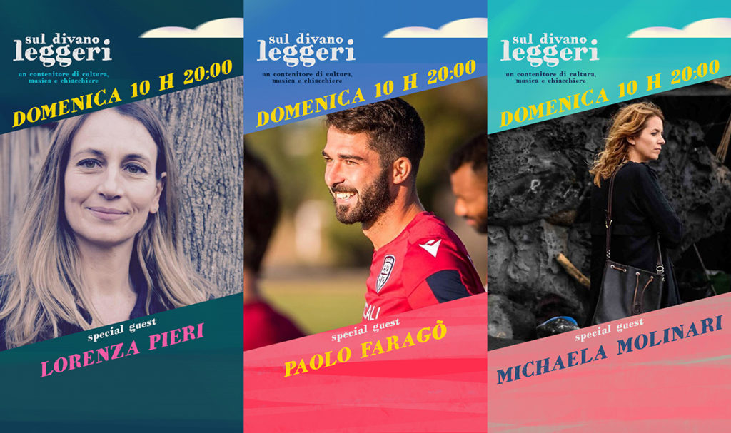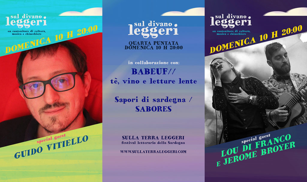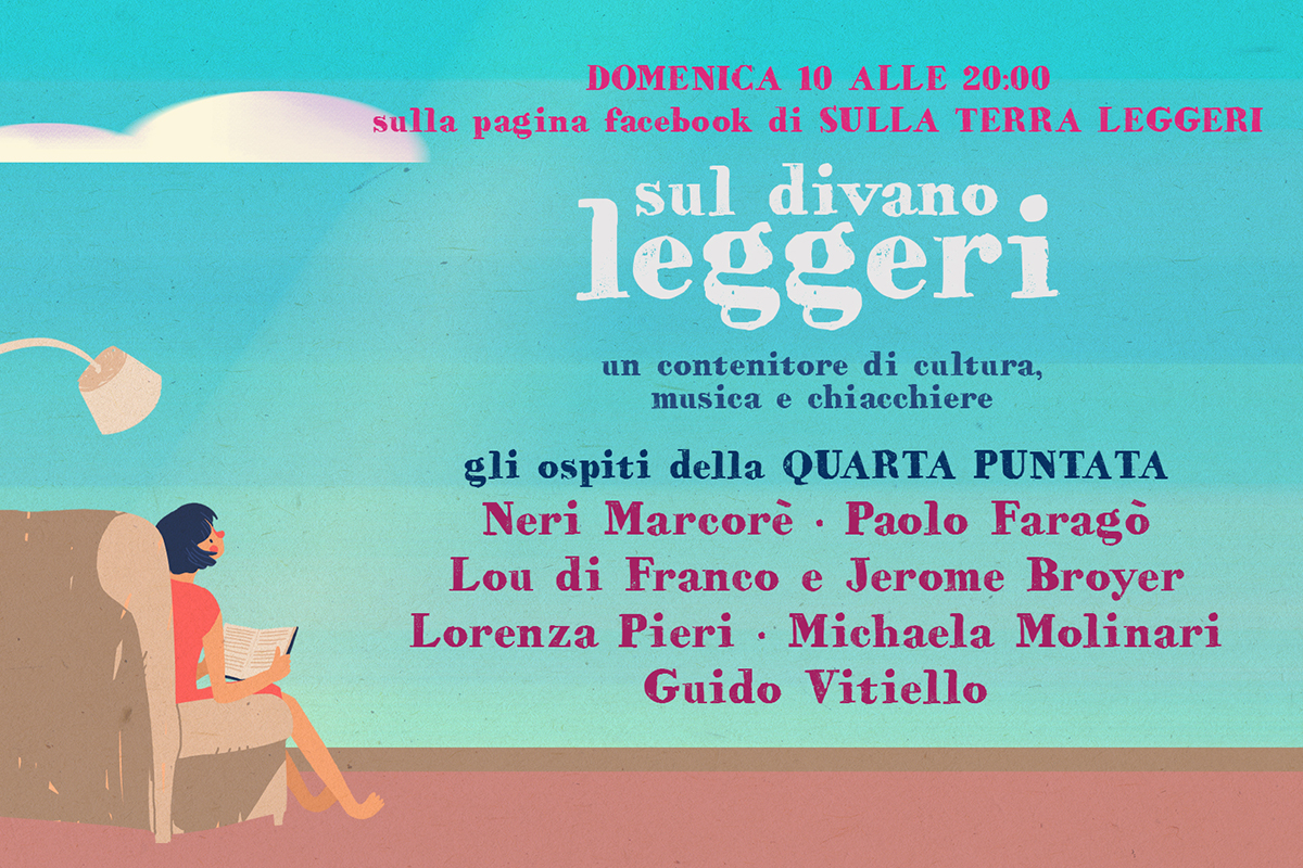 Prima domenica post lockdown e quarto appuntamento con #suldivanoleggeri, contenitore sperimentale del festival Sulla terra leggeri, format online che mette in connessione luoghi, arti, storie, persone, attori, scrittori, calciatori, librai e personaggi sparsi fra l’Isola, la penisola e il mondo intero. Uno spazio in cui il fare quotidiano si intreccia con la quotidianità casalinga di questo tempo e prende forma di risate, quiz, libri, rubriche, chitarra e pallone senza mai prendersi troppo sul serio ma comodamente seduti sul divano di casa. In leggerezza. Appuntamento a domani, domenica 10 maggio, h 20 – nuovo orario per lasciare lo spazio al pomeriggio all’aria aperta -sulla pagina Facebook Sulla Terra leggeri.